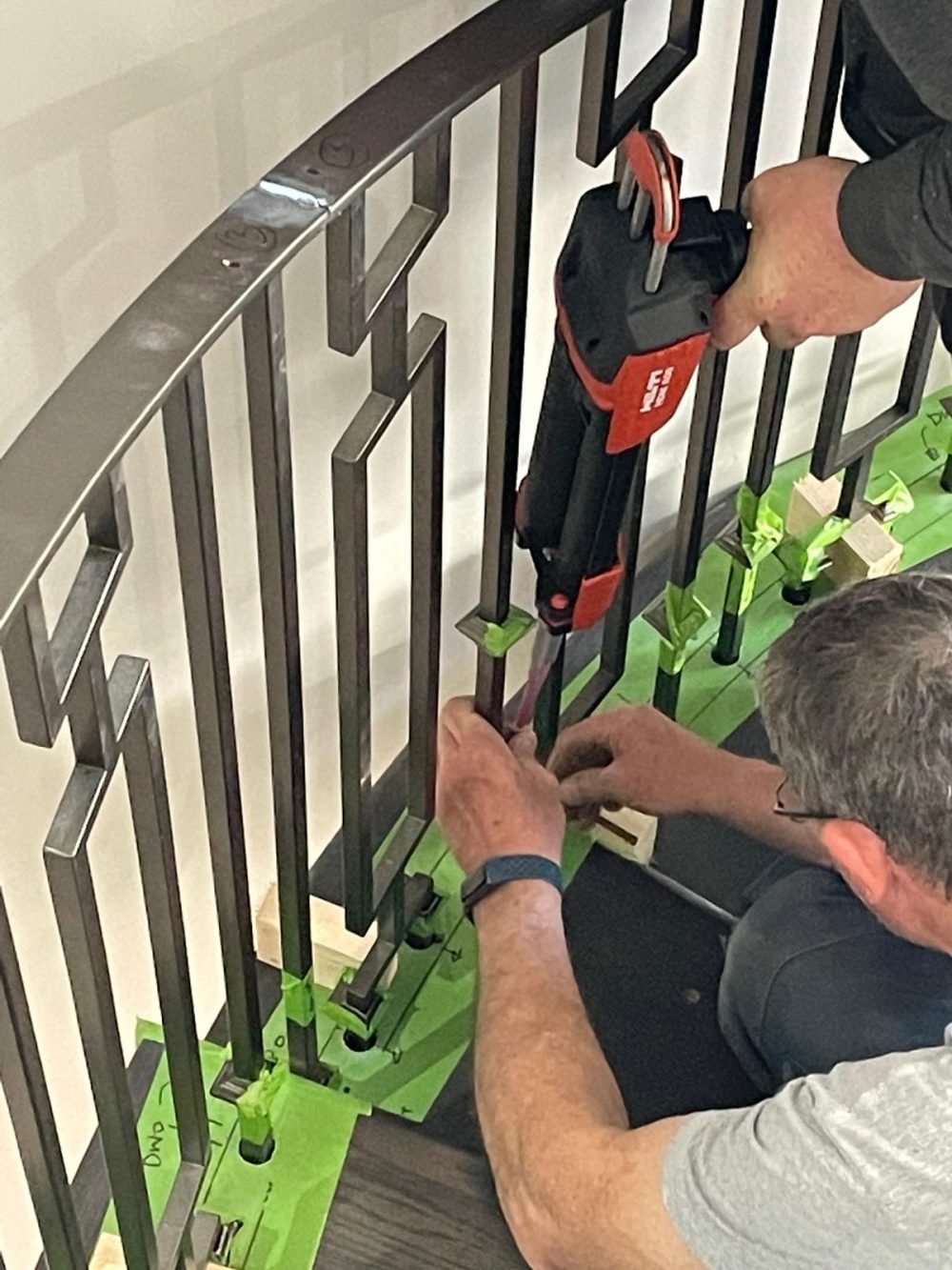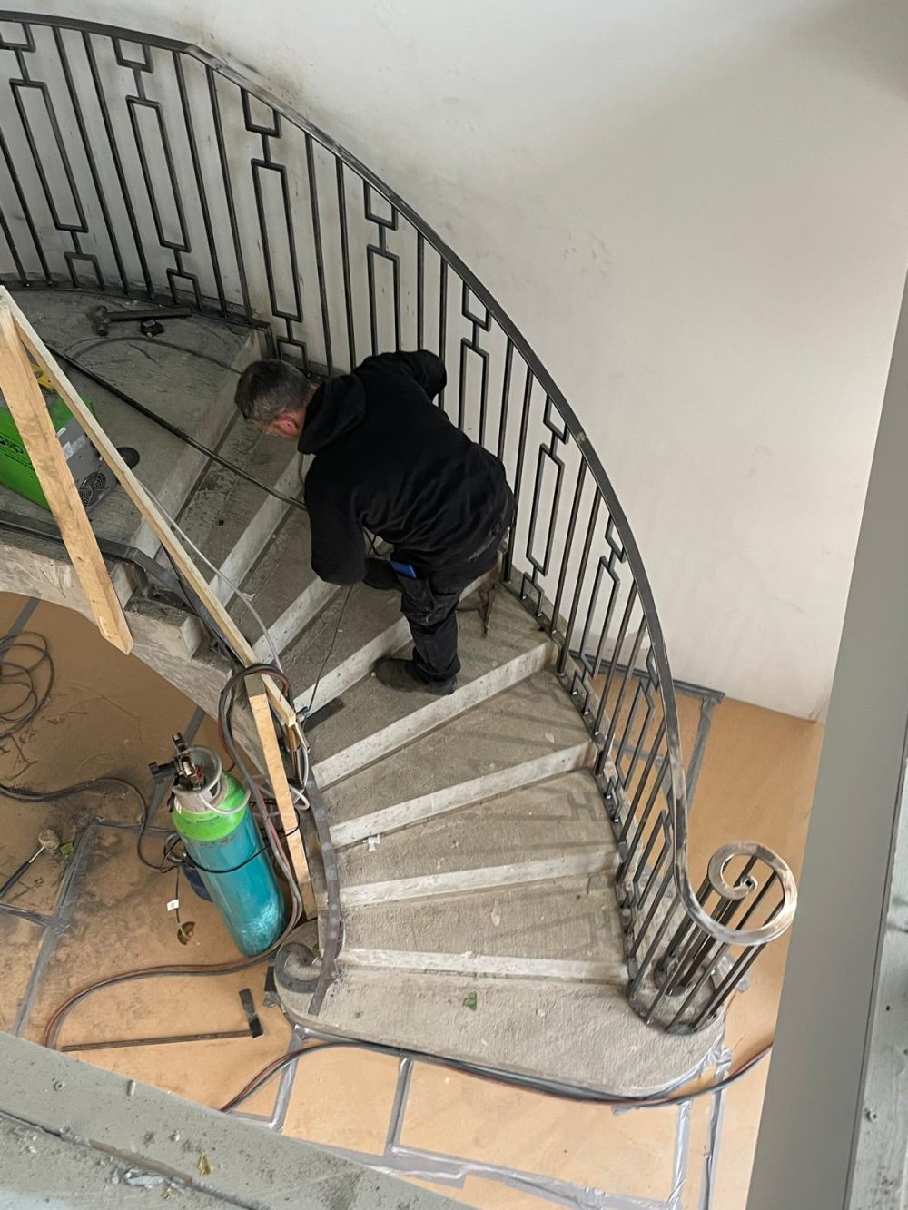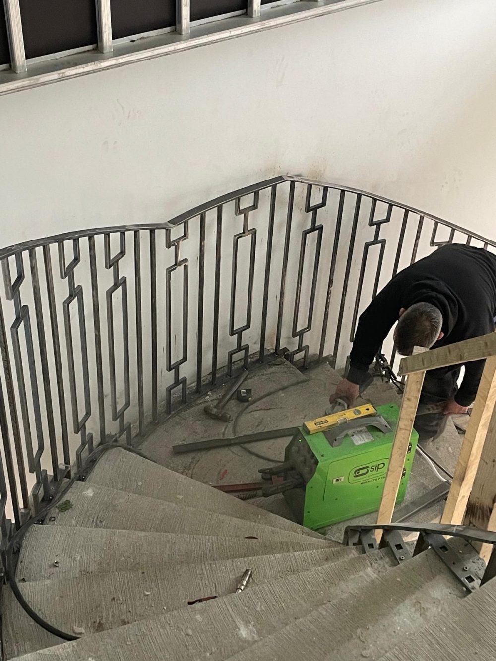 - 1. On-Site Pre-Fitting: We pre-made the entire balustrade directly onto the raw concrete steps (as seen in the “during” photos with our welding gear). This allowed us to perfectly map the balustrade to the stair’s true form, while also accounting for the exact depth of the timber treads that would be fitted later.