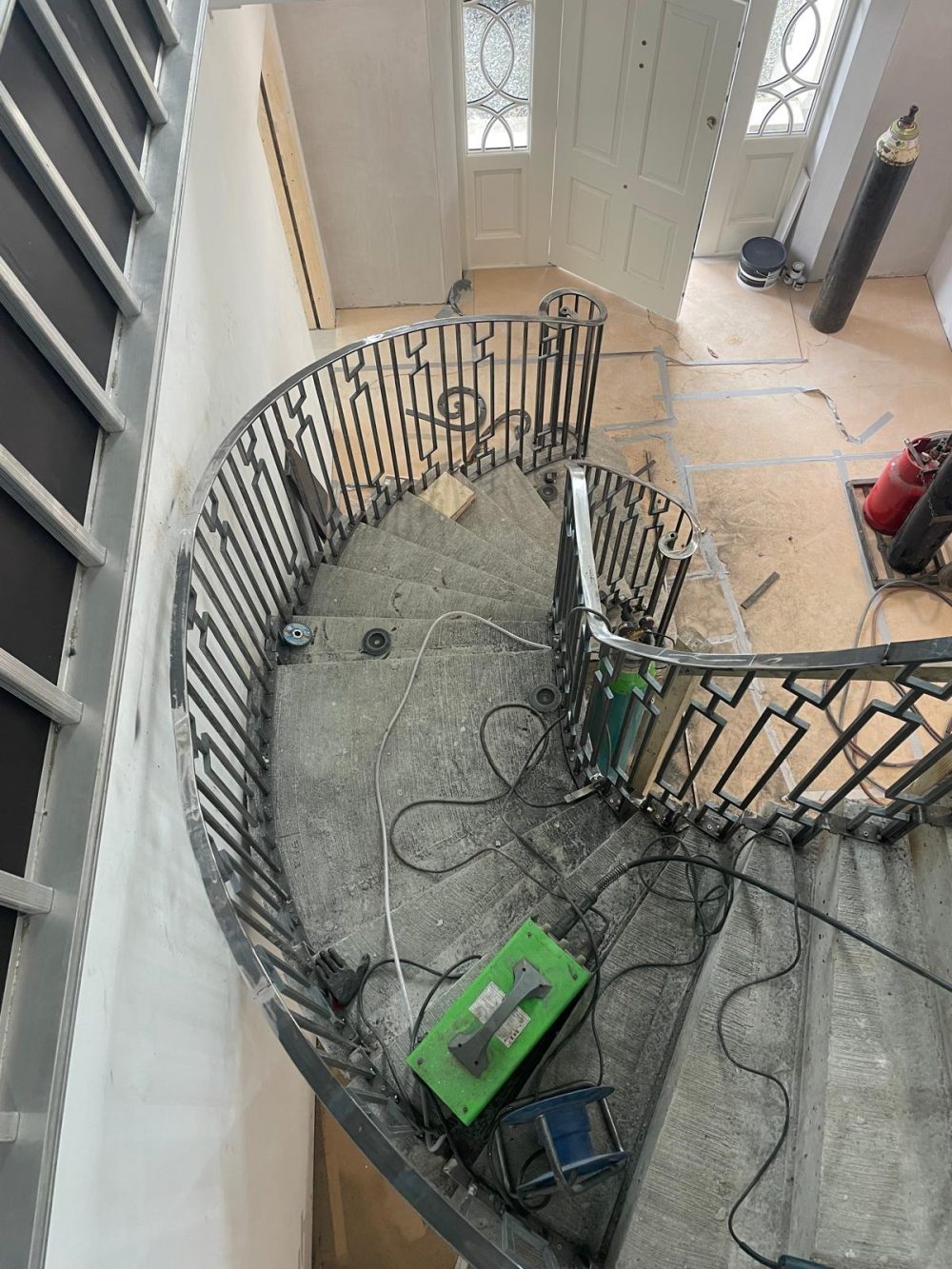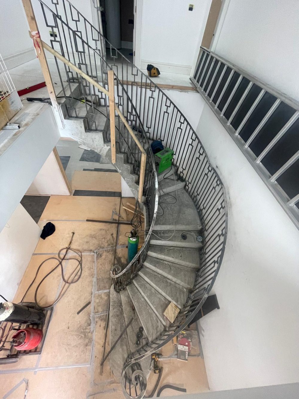 This high-end residential project in Dunloy was a true test of precision engineering and craftsmanship. Our team was commissioned to design, fabricate, and install a bespoke metal balustrade for a new, curved concrete staircase.