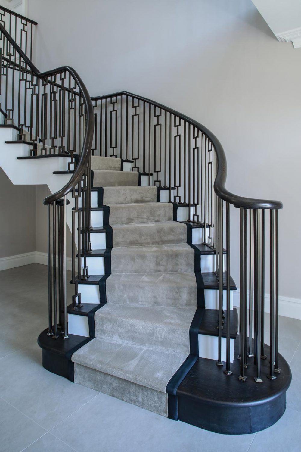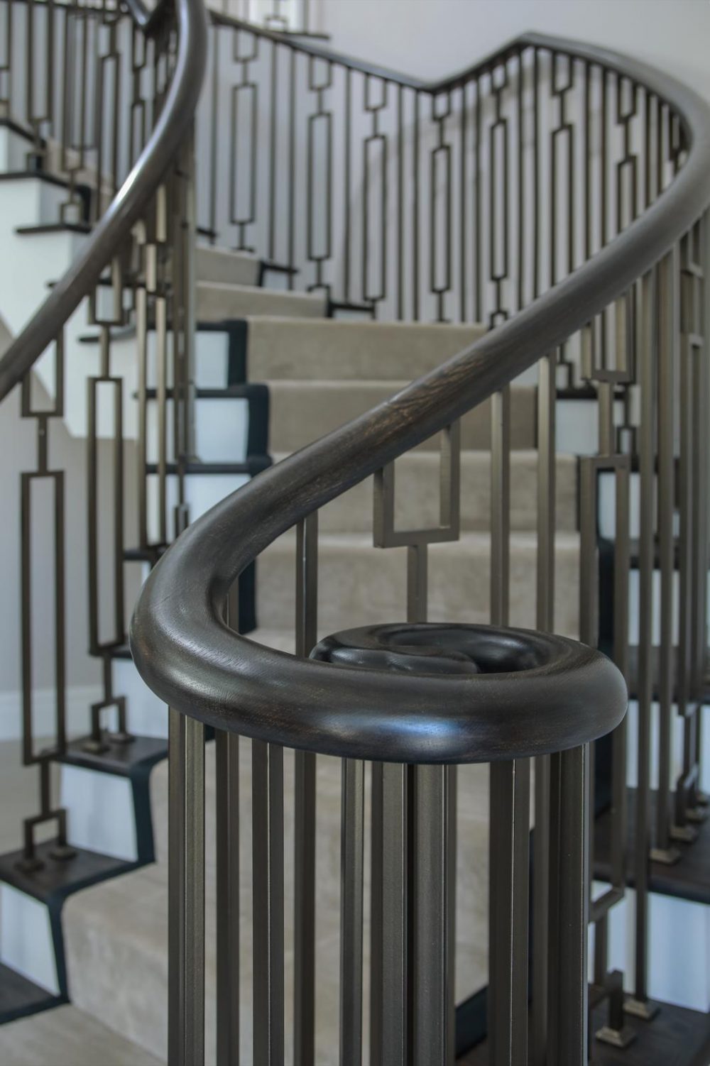 - 2. Custom Design: The balustrade features a striking, contemporary geometric pattern, custom-forged in mild steel. The handrail was expertly curved to follow the staircase, finishing in an elegant handcrafted volute (spiral) at the base.