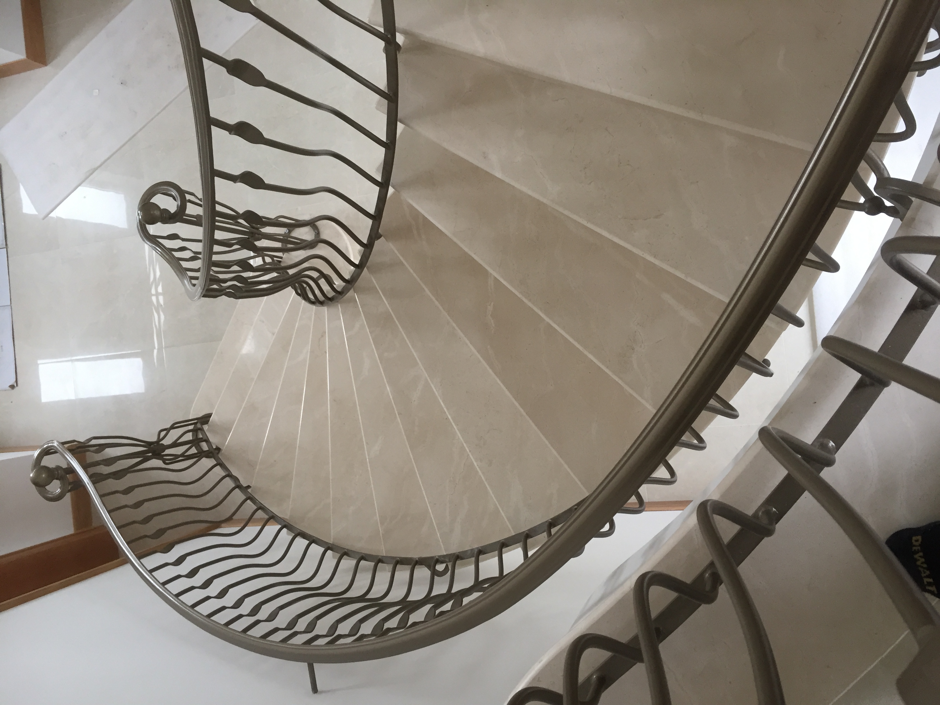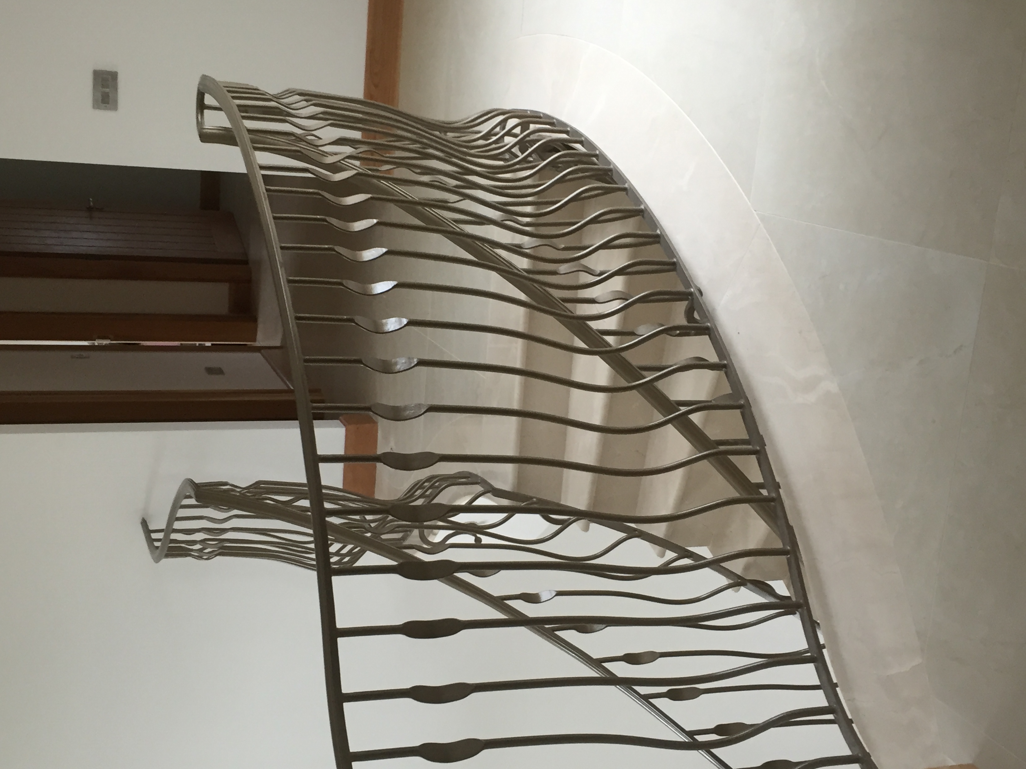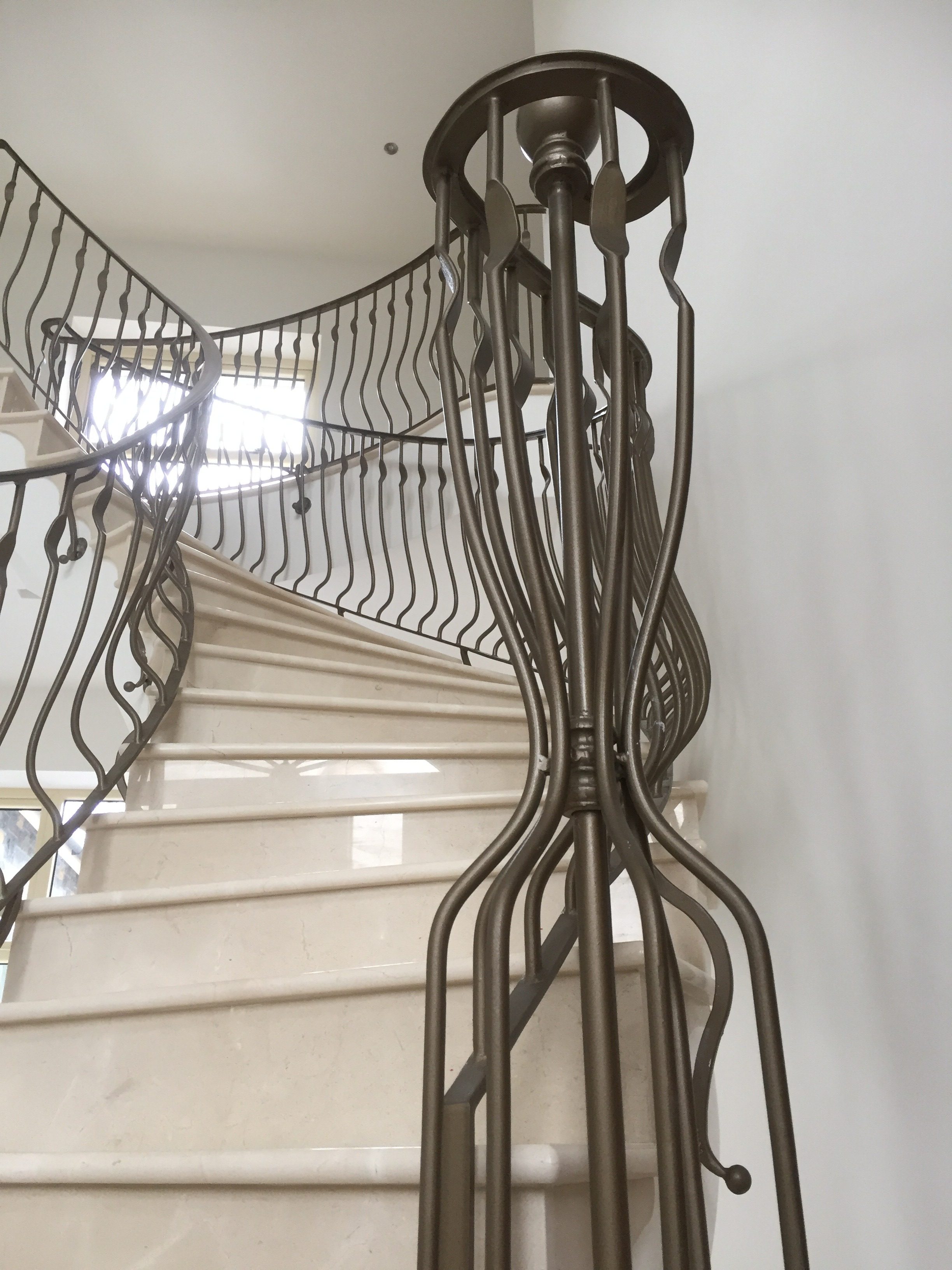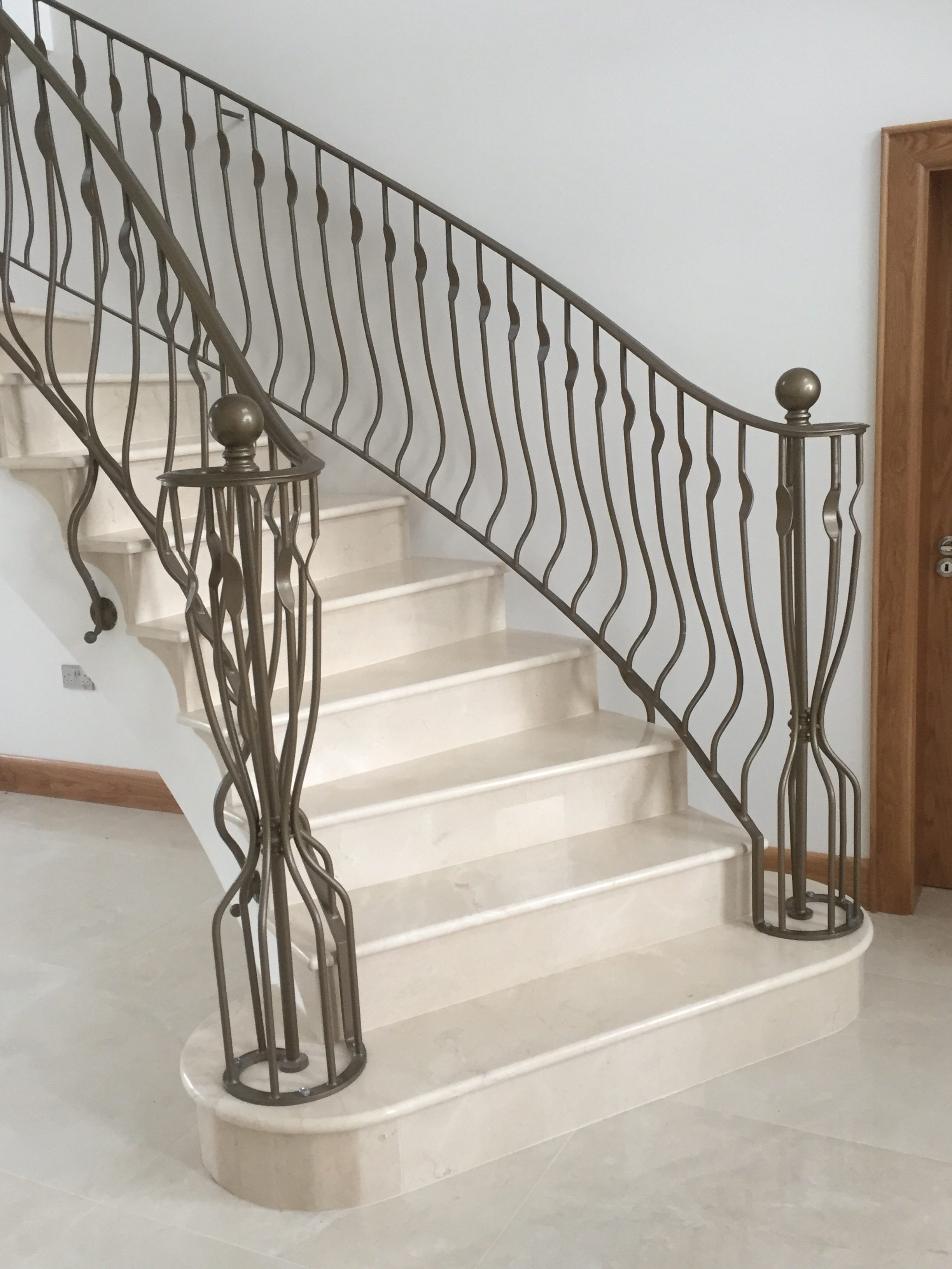 Transform your hallway with this stunning, custom-crafted staircase balustrade. Featuring unique, organic hand-forged spindles with a fluid "ribbon" design, this bronze-finished metalwork adds a contemporary artistic flair to a classic curved stone staircase. The intricate design includes a decorative "birdcage" newel post with a spherical finial, providing a luxurious and highly personalized architectural centerpiece for any premium home.