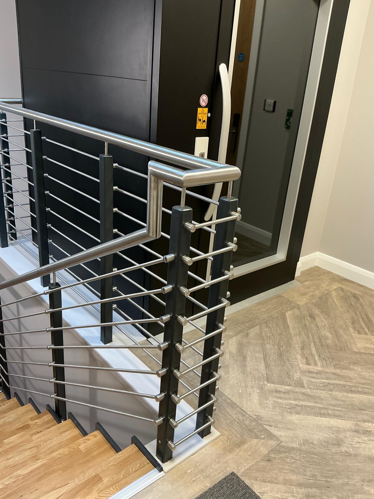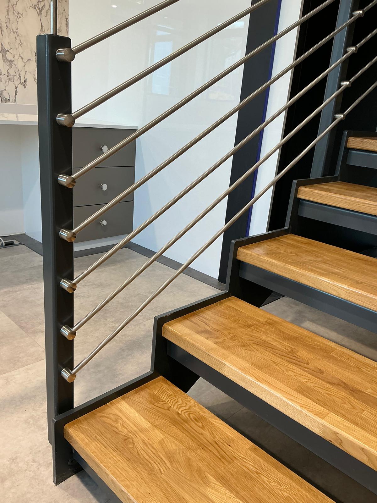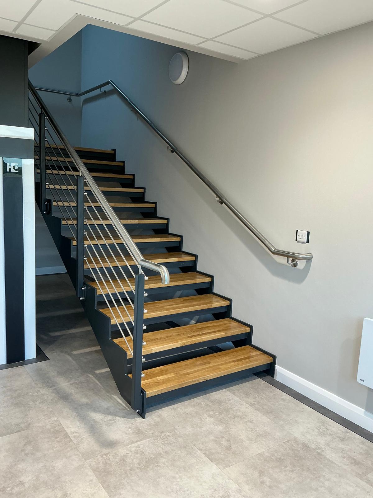 Contemporary staircase featuring powder coated steel stringers, solid timber treads, and stainless steel horizontal bar balustrade. Clean lines and durable materials create a strong, modern finish, suitable for commercial or residential interiors requiring both structural integrity and refined visual appeal.