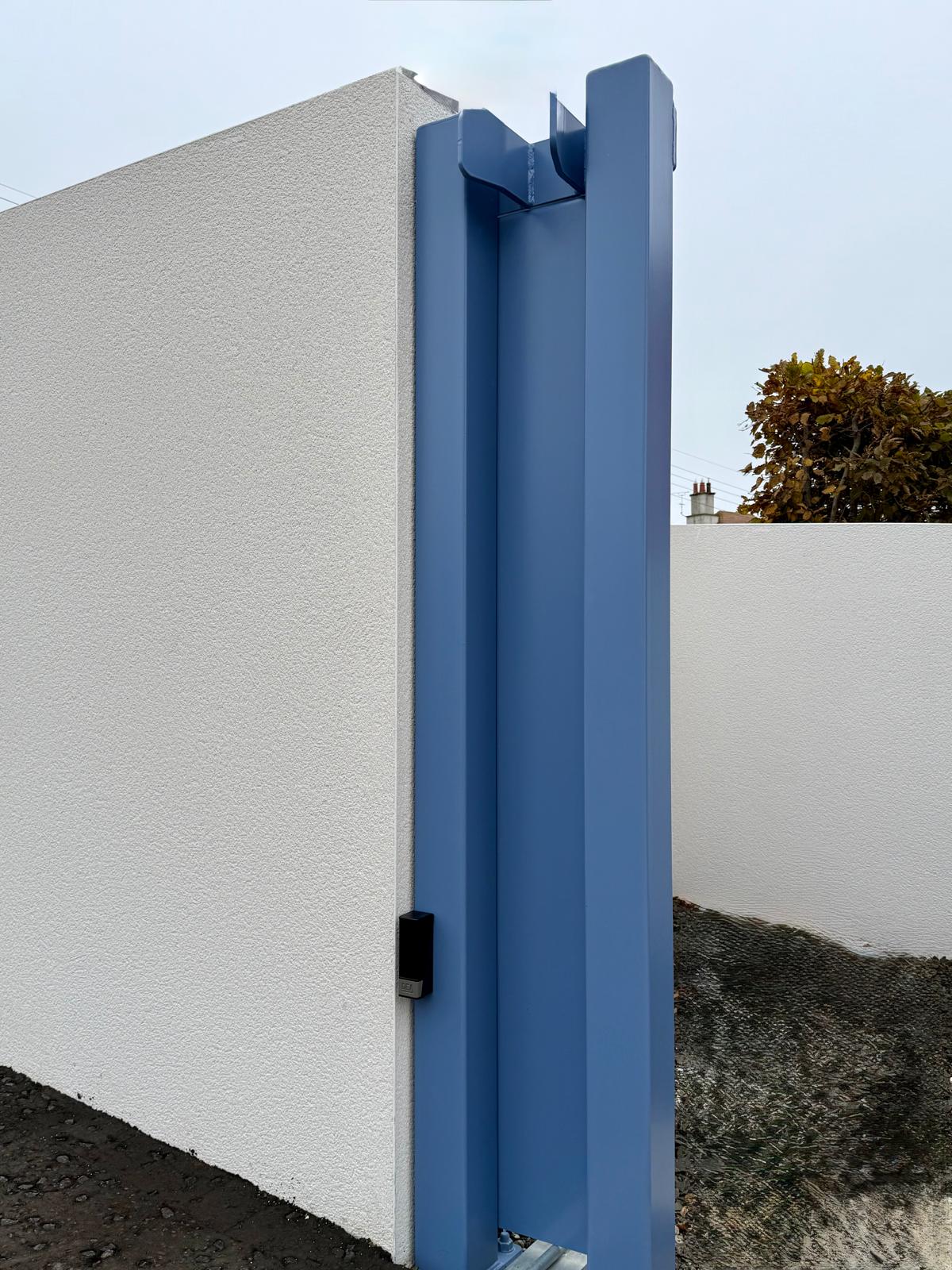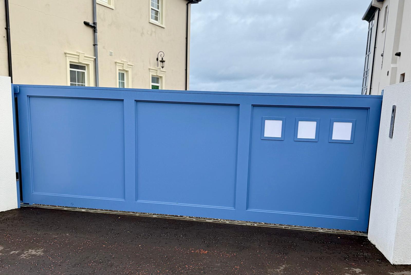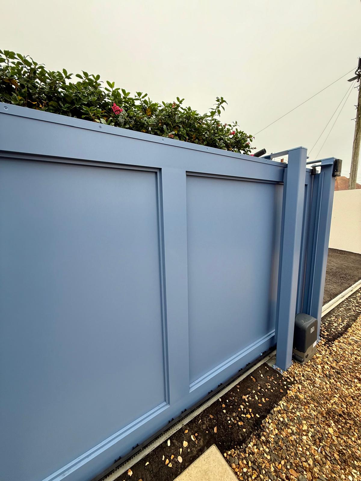 Modern sliding aluminium gate finished in powder coated blue, featuring recessed panel detailing and integrated automation system. Includes safety sensors and motorised track for smooth operation. Designed for privacy, durability, and a clean architectural appearance suited to contemporary residential properties.