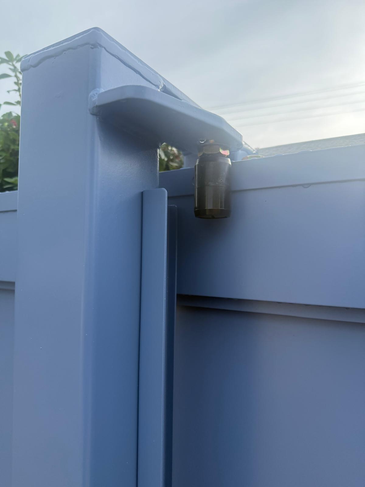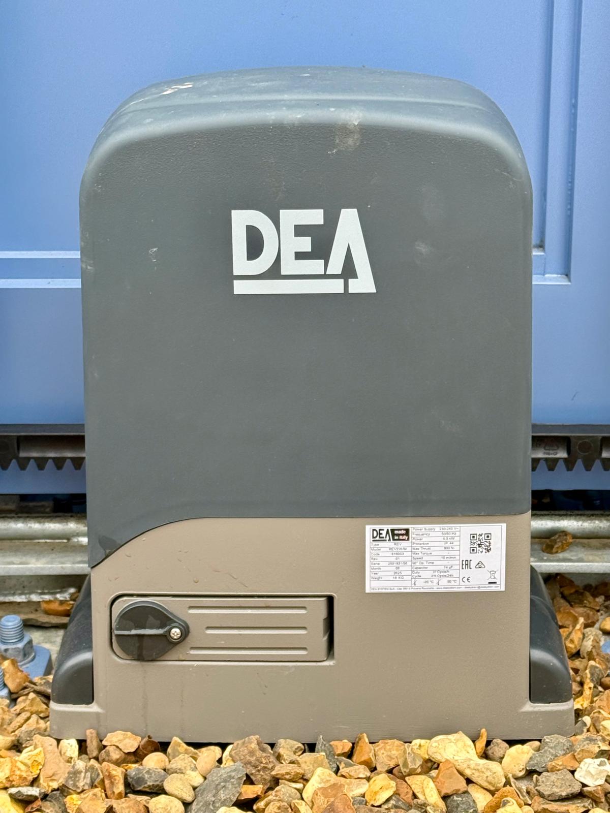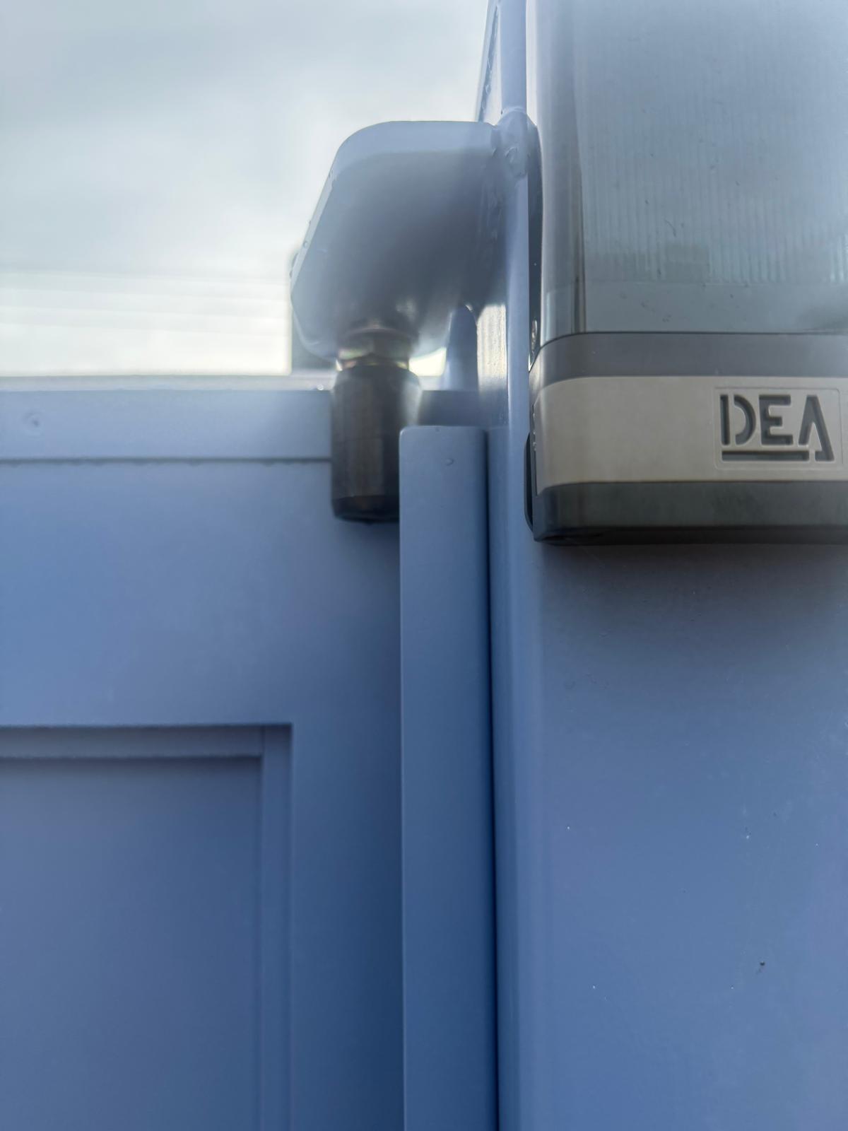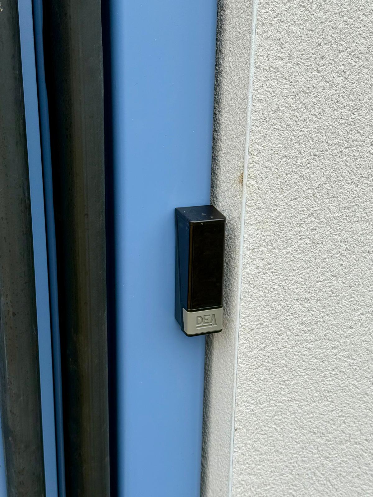 Modern sliding aluminium gate finished in powder coated blue, featuring recessed panel detailing and integrated automation system. Includes safety sensors and motorised track for smooth operation. Designed for privacy, durability, and a clean architectural appearance suited to contemporary residential properties.
